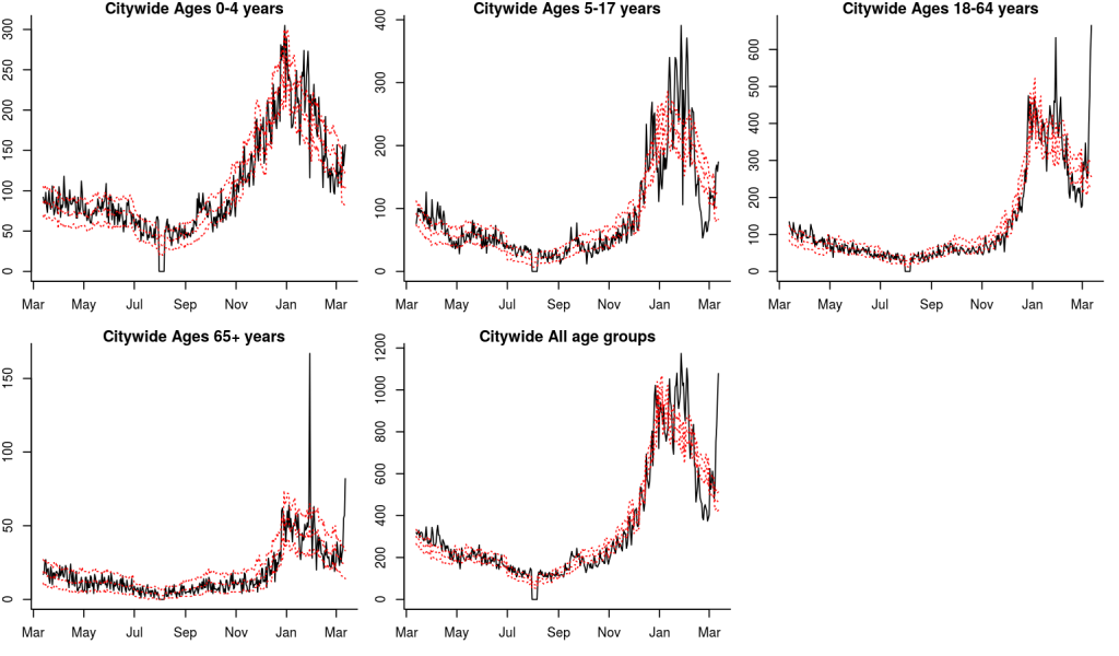 , stratified by age and borough. Clear spike in older age groups: NYC ED syndromic surveillance