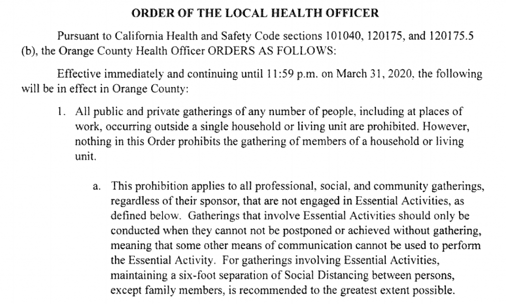 #US #CA #OrangeCounty Prohibition applies to all professional, social, & community gatherings not involved in Essential Activities. Maintain 6' separation of social distancing between persons. @ochealth
