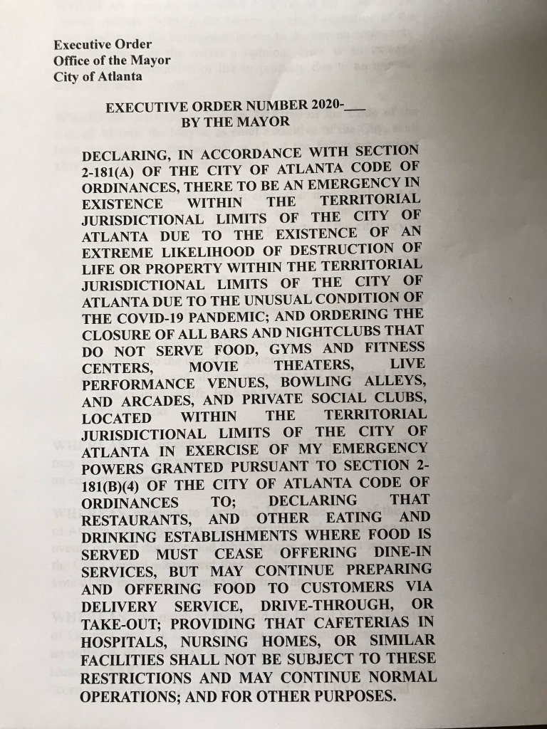 I have signed an Executive Order, effective at midnight, limiting restaurants to take out service, closing bars, gyms, etc. The fate of cities across the globe will be upon soon if we do not follow recommendations on ways to slow the spread of the Coronavirus. Keisha Lance Bottoms on Twitter