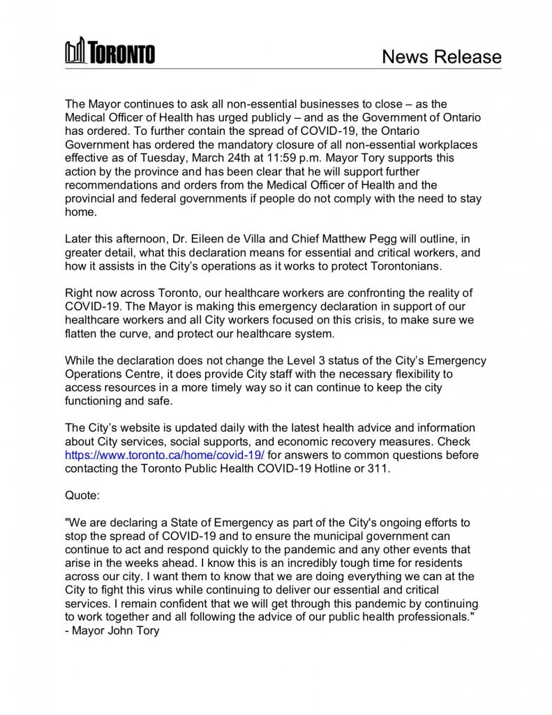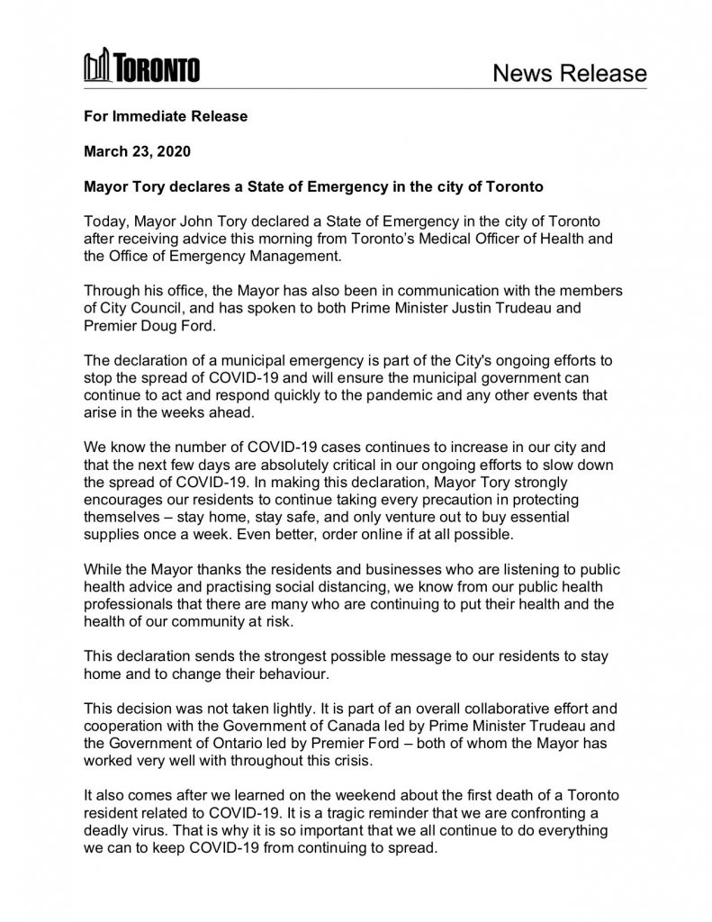 We are declaring a State of Emergency as part of the City's ongoing efforts to stop the spread of COVID-19 and to ensure the municipal government can continue to act and respond quickly to the pandemic and any other events that arise in the weeks ahead. John Tory on Twitter