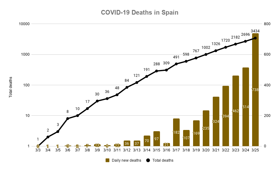 #COVID19 Spain heartbreaking numbers with 738 new deaths today, crude case fatality rate ~7.2%