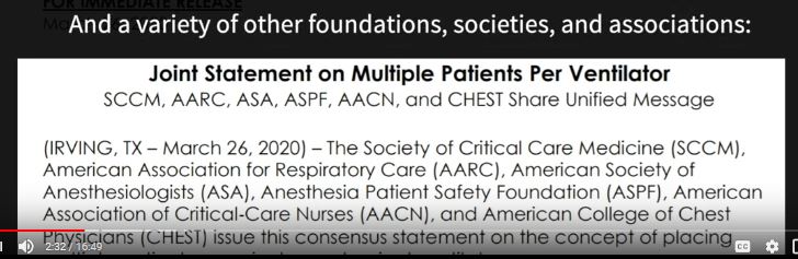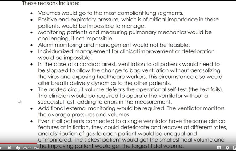 American Association for Respiratory Care, The Society of Critical Care Medicine, American Society for Respiratory Care, American Society of Anesthesiologists, American Association of Critical-Care Nurses and many other groups have come out against use of the valve which allows multiple people to use one ventilator. I did a screen shot of some of the reasons they listed.
