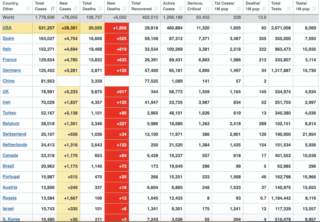 Coronavirus Update (Live): 1,777,892 Cases and 108,742 Deaths from COVID-19 Virus Pandemic - Worldometer