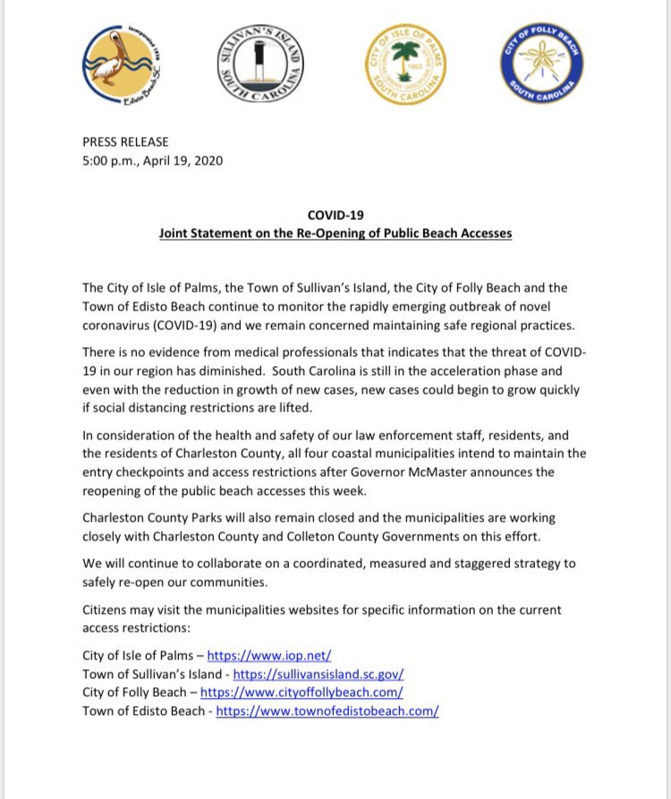 SOUTH CAROLINA - Isle of Palms, Sullivan’s Island, Folly Beach, and Edisto Beach say they will continue restricting beach access even if @henrymcmaster announces the reopening this week. Temple Ricke on Twitter