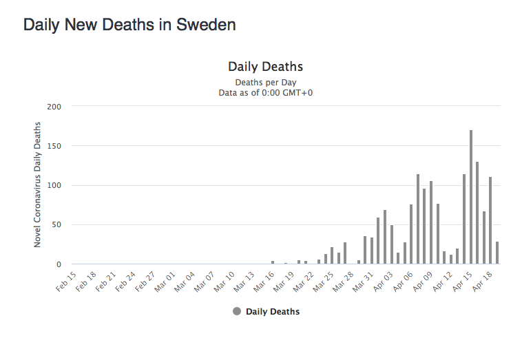 I am watching Sweden's number's daily. Here is the daily death count. I don't see a disastrous situation. Note the weekends have a lull in reporting that is picked up mid-week. The results agree very well with the IHME models for Sweden, which has a peak in 10 days. There are no surprises in what is happening. Sweden's per capita death rate is expected to be around the same as Spain, which has had full lockdown (from my previous post).