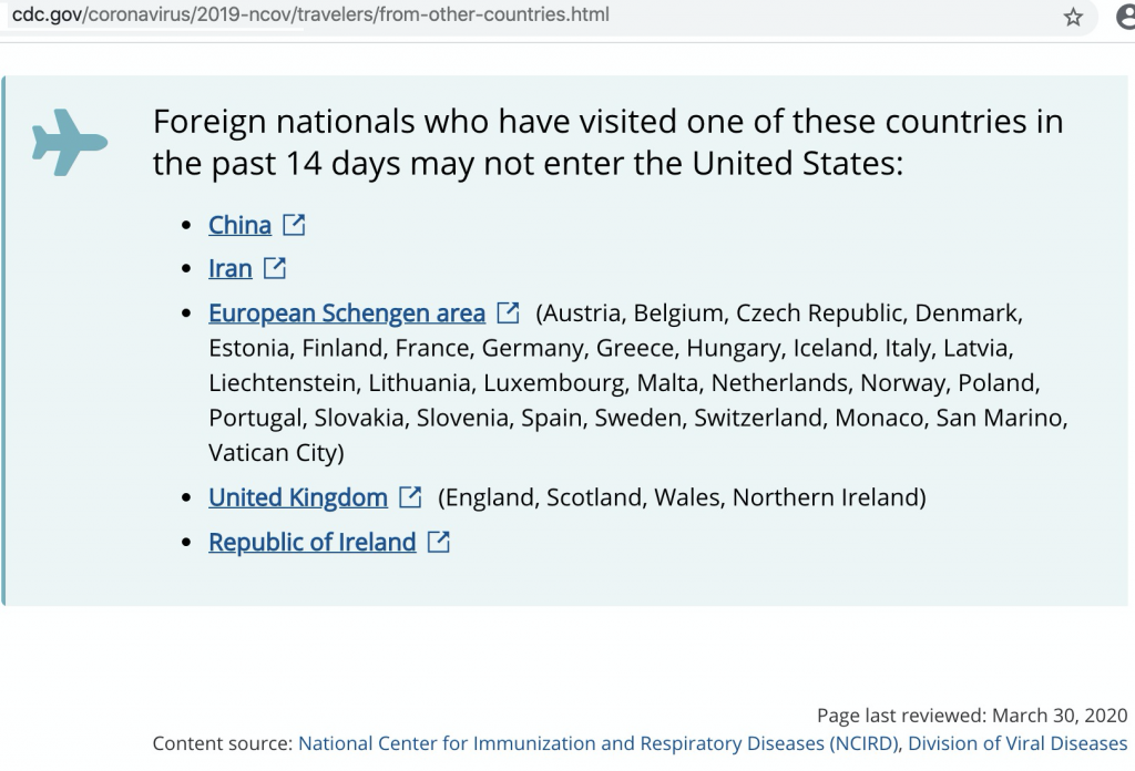 On March 11 the United States barred the entry of all foreign nationals who had visited China, Iran and a group of European countries during the previous 14 days.
