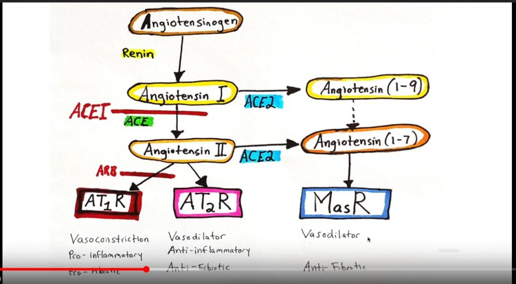 At 8:03 As this shows, if someone has Ace inhibitors, that SHUTS DOWN ON THE LEFT SIDE ALAO even that option to go further with the Angiotensin I to Angiotension II. STOP. No more option to go further to even get to the options in the next step with Angiotensin II to go in the alternate paths of vasoconstriction/inflammation/fibrosis vs. vasodilator/anti-inflammatory/antifibrosis. The normal cascade options are all fouled up with NO options with an ACE inhibitor.