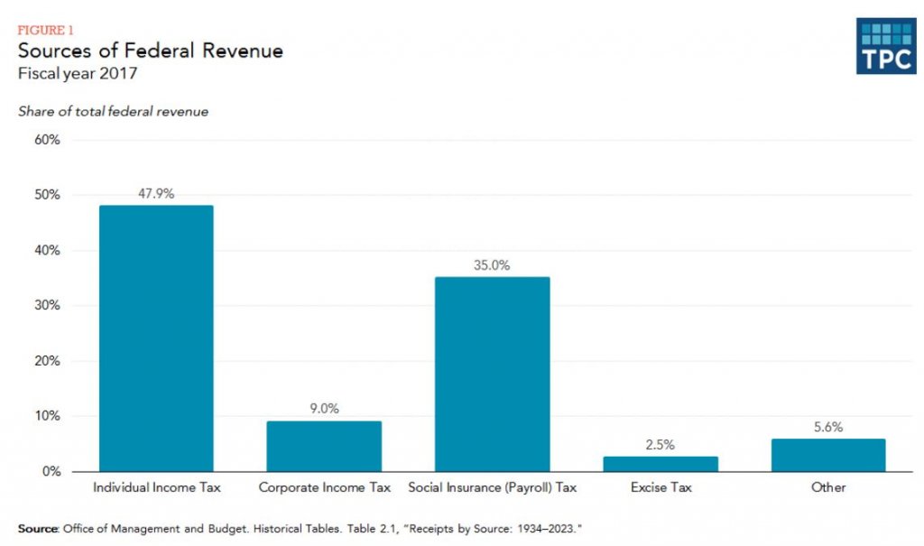 Another huge 35% of tax revenue comes from Social Insurance (payroll) tax - which supports things like Disability insurance benefits, Medicare benefits, and unemployment benefits.
