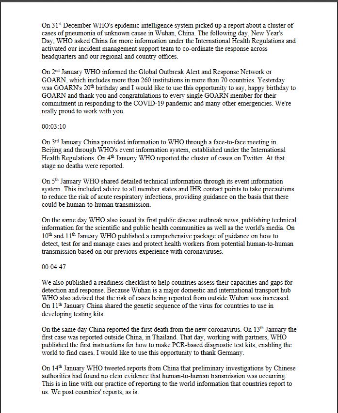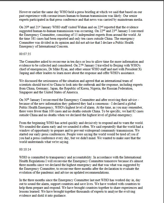 The transcript for yesterday's WHO presser is out @margarita25 . Today is three months since the DG declared a Public Health Emergency of International Concern. Today, he will be reconvening the Emergency Committee (consists of 15 independent experts from around the world) to evaluate the evolution of the pandemic and advise on updated recommendations. He gave a summary of efforts to dates at the outset, but for some reason I cannot cut/paste in the formatting they put on line as @margarita25 seems to be able to do, so I did screenshots of two pages.