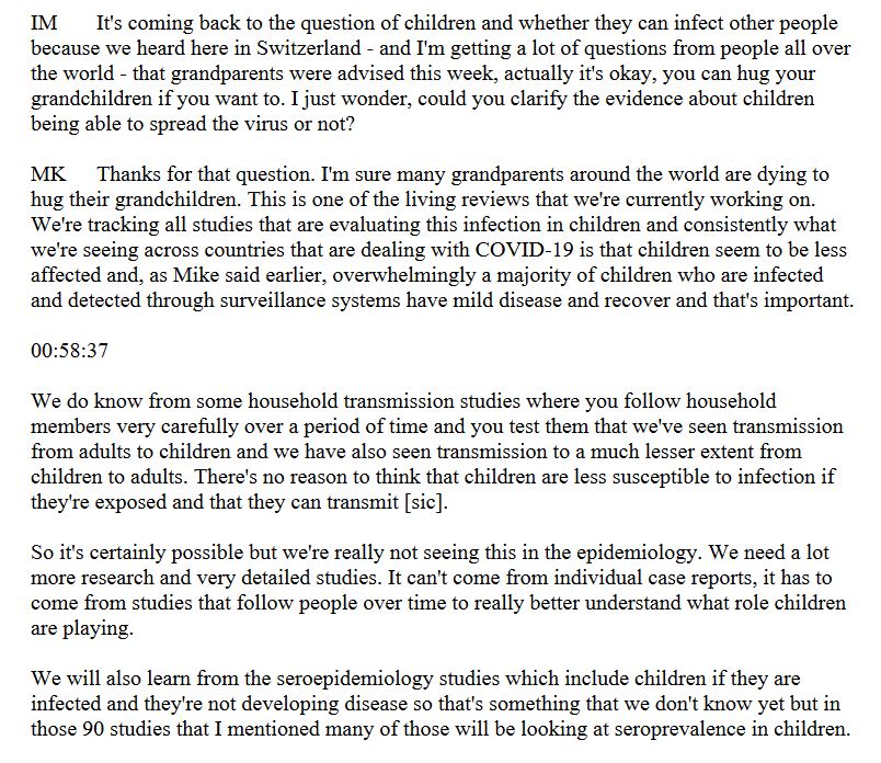 The WHO spoke to such yesterday as they had seen that report. I cannot seem to cut/paste... so here are two screenshots of the discussion/answer re the report of the Switzerland edict two days ago re hugging kids. (for those that cannot read it, more studies needed, and they point to if kids are asymptomatic, the don't cough as much, is disease "dose related" etc... so don't perhaps spread as much)