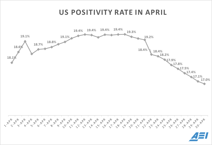 "Positivity rates for covid19 testing nationally are starting to decline as testing expands sharply and we move more testing away from hospitals and into community (where overall prevalence is generally lower) and as infection declines in some areas, especially hard hit New York."