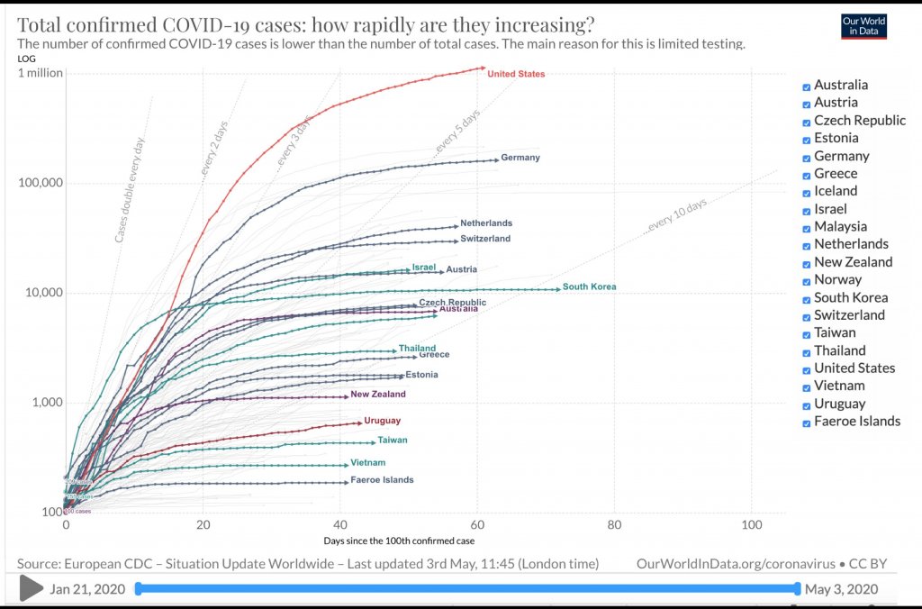 "In contrast, more than 20 countries have achieved flattening, horizontal case curves, a few at or nearing zero (add Hong Kong, a region)"