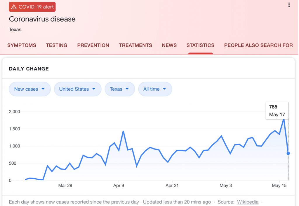 The number of COVID-19 cases in Texas has decreased by over 1,000 cases in one day, despite the fact that Texas has increased its testing rates exponentially.