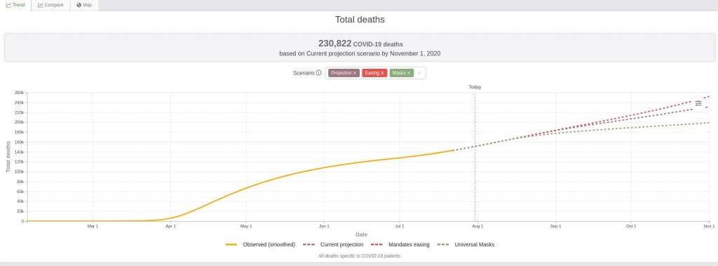 - Projection from University of Washington’s Institute for Health Metrics and Evaluation (IHME) of deaths by 1 Nov. has risen from 215,000 to 230,000.