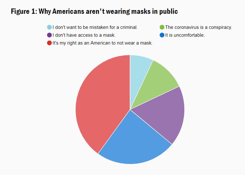 And then this pie chart shows the breakdown of reasons for not wearing a mask. About 150 of those 1200 people were in denial that there is a pandemic.