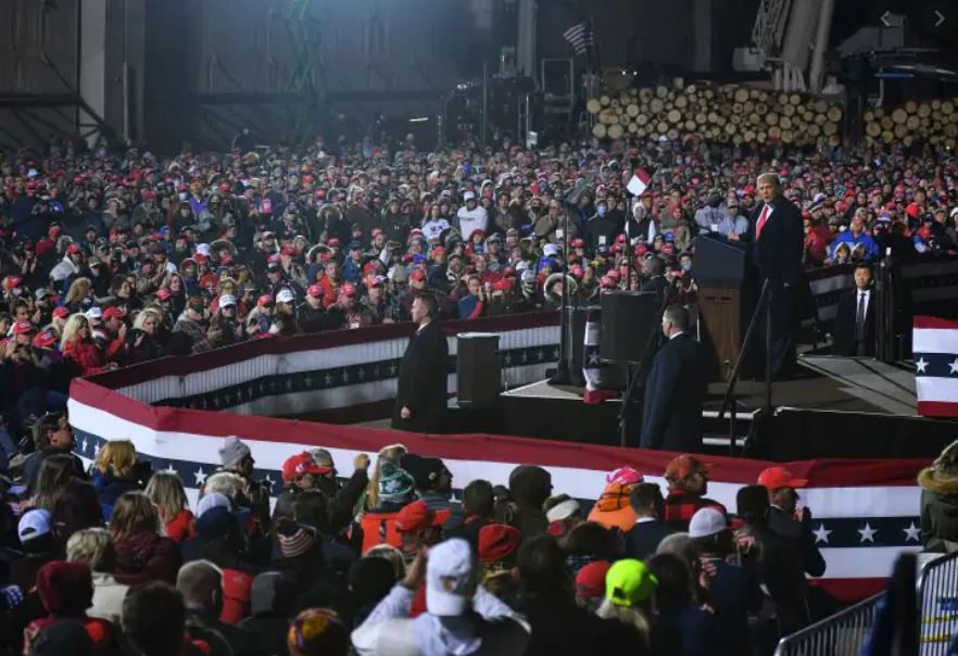 Yes that is a pic of him walking along a ramp from AF1 to the podium ( he is throwing hats to the crowd you can see) and a pic of him on the podium. Both of those pics he is socially distanced from the unmasked large crowd but directly behind him on the podium, everyone was masked. I don't think his security would expose him to dangers.