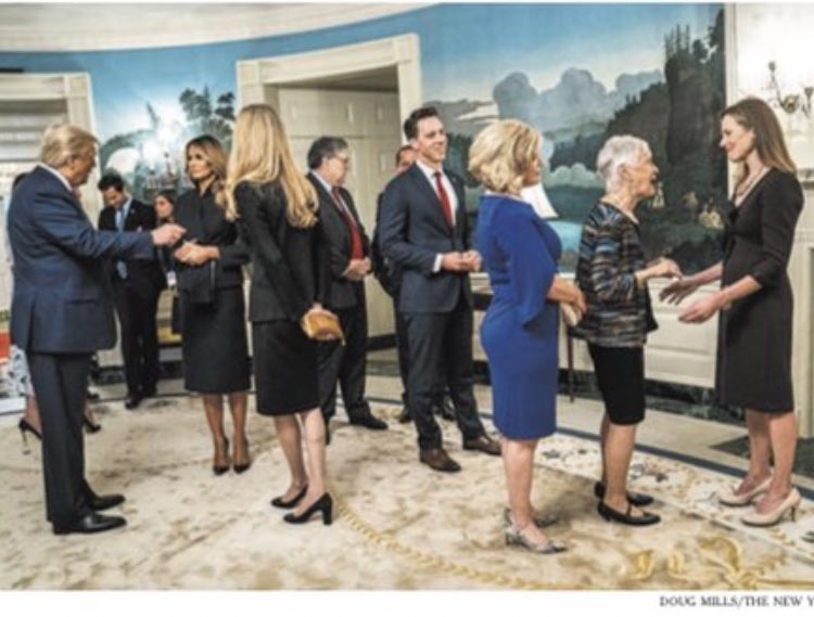First row, left to right: Kate Todd, Pat Cipollone, White House Chief of Staff Mark Meadows, Attorney General William Barr, Tiffany Trump, second lady Karen Pence, Vice President Mike Pence