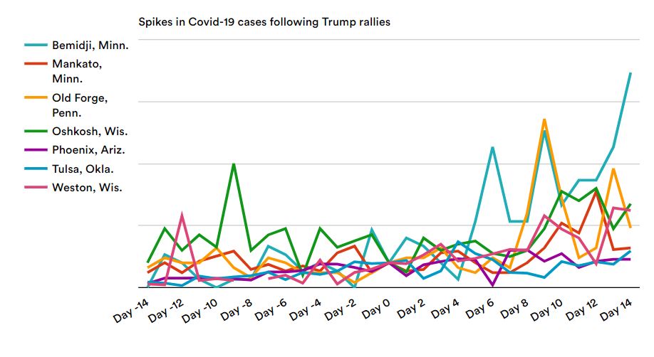 What we found was sobering yet not surprising. Spikes in Covid-19 cases occurred in seven of the 14 cities and townships where these rallies were held: Tulsa; Phoenix; Old Forge, Penn.; Bemidji, Minn.; Mankato, Minn.; Oshkosh, Wis.; and Weston, Wis.