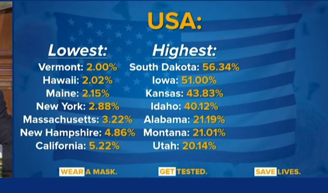 Knowing that the goal is to keep below 5% positive for testing goal, it is mind boggling to see this screen shot. South Dakota at 56.34%, Iowa at 51% etc....