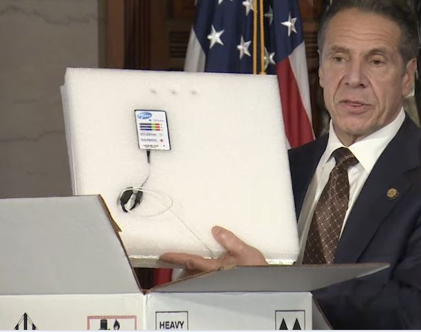 Cuomo is talking about vaccines, and to show how real it is, at 12:45 timestamp, he's opening up a mock container of Pfizer vaccines that has been received. (Pfizer got no assistance from government, and is a New York company) Has a geomonitor (GPS like) and a temperature probe so can be monitored as to where it is, and what temp it is at all times. He's going into quite a bit as to how it's handled!