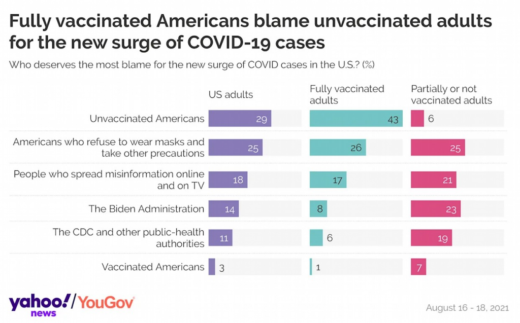 The survey of 1,649 U.S. adults, which was conducted from Aug. 16 to 18, found that just 6 percent of those who remain unvaccinated say they are the ones who deserve “the most blame for the new surge of COVID cases in the U.S.”