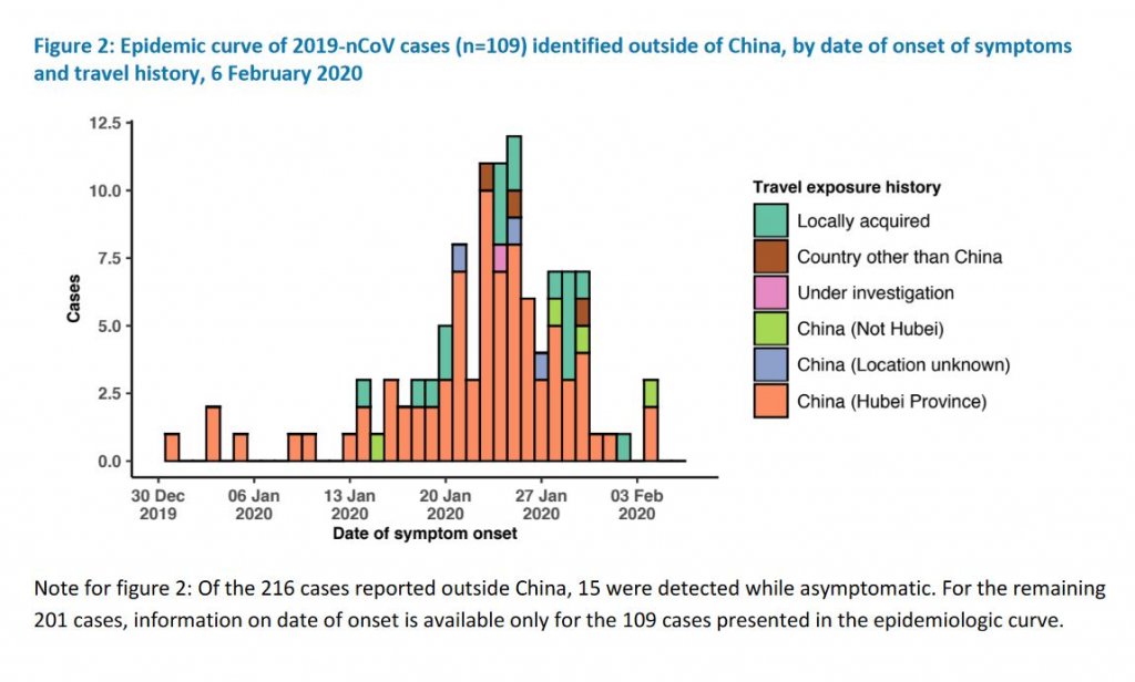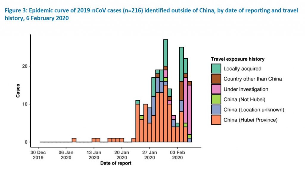 Epidemic curve of 2019-nCoV cases (n=216) identified outside of China, by date of reporting and travel history