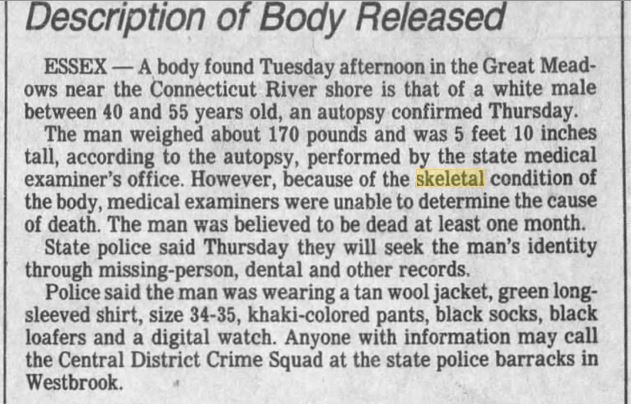 My questions for this guy are: Why isn't there a location? Where was he that he could keep all of that stuff nearby even though he was found 10 years after he died? (So 1973?) What body parts didn't they find? Is that why they couldn't estimate height... Even though they seem to have a full set of clothes? Why aren't there any circumstances listed? Why isn't there a recon? I'd love to see what they meant by the left side protruding more. I feel like that would help me envision him a lot better.