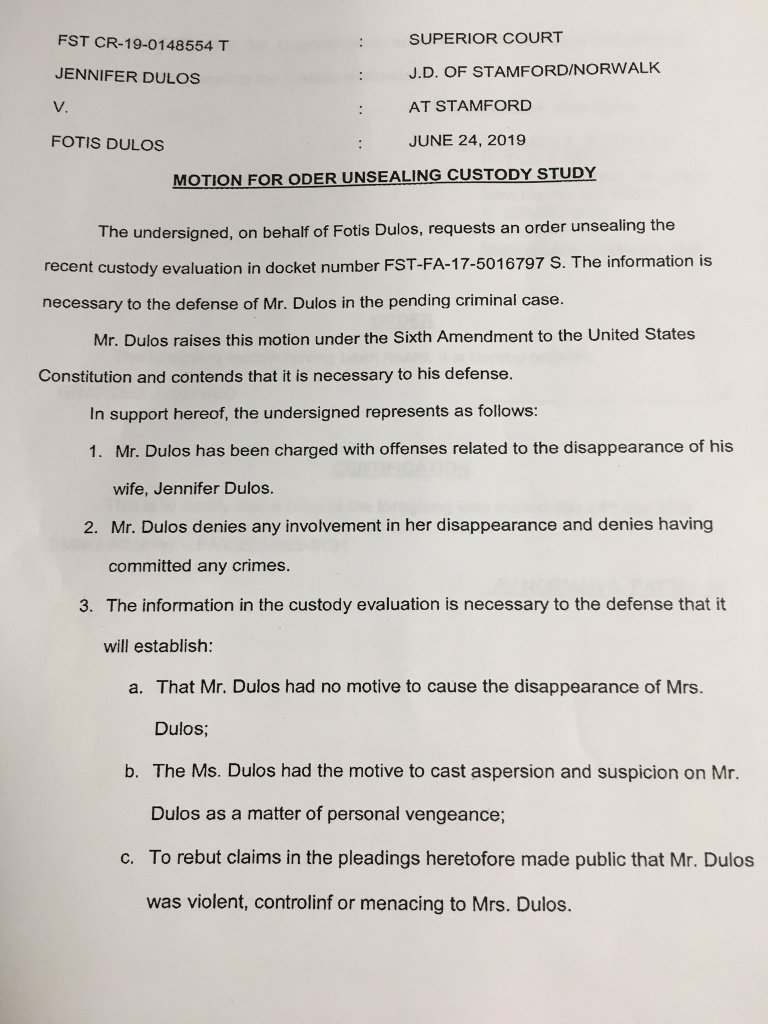 Lawyers for Jennifer Dulos’ mother, who is in custody of the children, have asked for a status conference on the evaluation because they believe a court order was violated. They said “quoted statements” on the report made by Norm Pattis, Fotis Dulos’ attorney, “which is true, are in direct violation of the court order