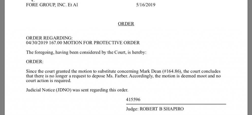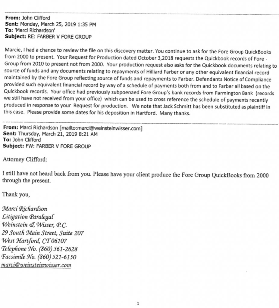 @Tink56 so this is what happened: In the GF vs FD lawsuit she requested to change the person who represents the Farber Estate and will of Hilliard Farber since she said she doesn’t know as much as the retired attorney John Schmitt did since he personally dealt with Hilliard’s business dealings and current attorney Mark Dean. Also because FD was using this lawsuit as a chance to harass her because he was angry about the divorce. She got both substitutes approved even though FD objected to the substitutes. They dragged that on for couple months up until 5/16/19 , 8 days before her death. Attached is them asking for quickbooks since February and FD Attorney Clifford dodges then.