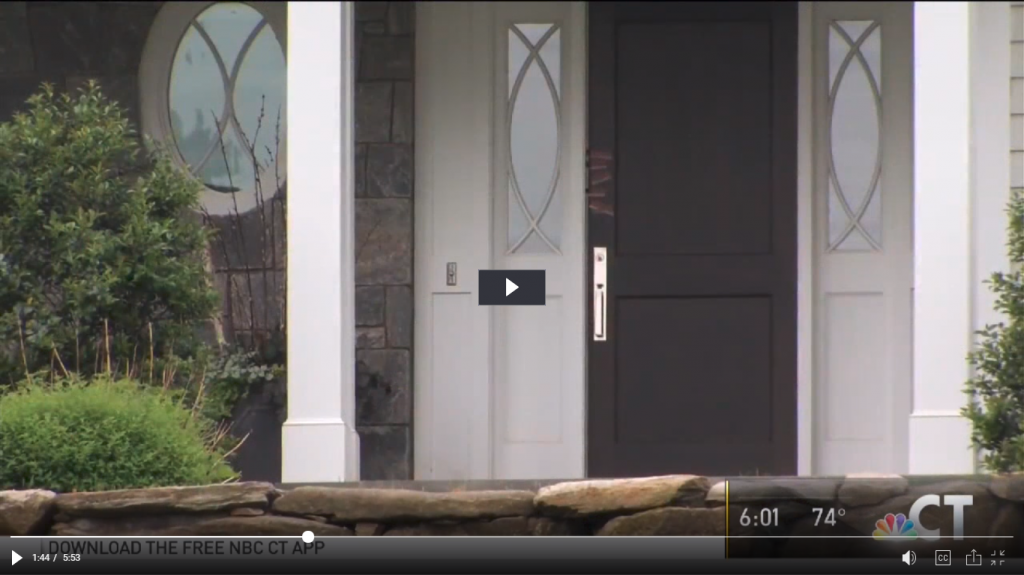 Looks like evidence tape on the front door of JDs home (screen capture below from mark 1:44 in video at this link Family of Missing Mom Jennifer Dulos Releases New Statement)