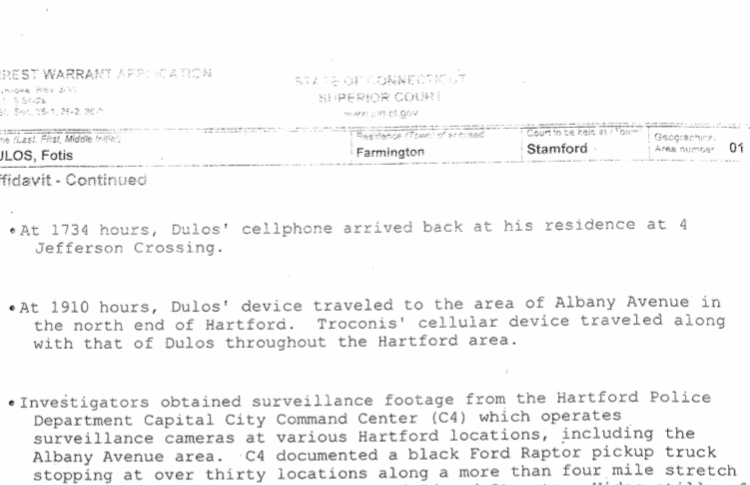 "At 1910 hours, Dulos' device traveled to the area of Albany Avenue in the north end of Hartford. Troconis' cellular device traveled along with that of Dulos throughout the Hartford area." https://int.nyt.com/data/documenthe...rants/6d596144af51cba22c02/optimized/full.pdf