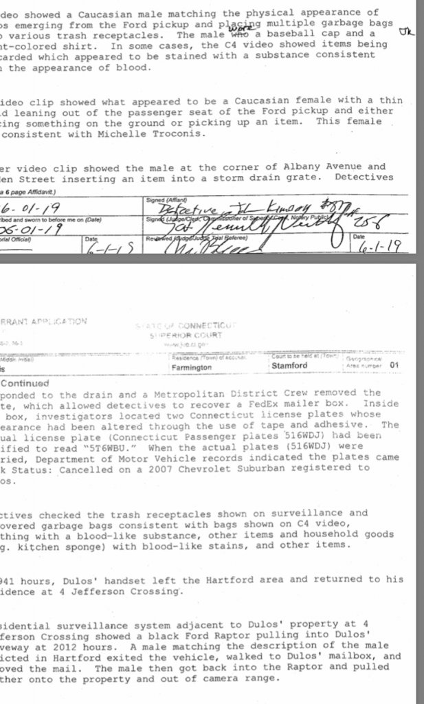 In the Arrest Warrant Jennifer Dulos’s vehicle is listed as a 2017 black Chevy Suburban. The altered license plates found in the storm drain in Hartford where a man matching FDs appearance was seen inserting an item were queried by police and found to come back as “Status Cancelled belonging to 2007 Chevy Suburban” registered to Fotis Dulos. Hopefully when I did my FAQ summary that I posted earlier didn’t contain a typo or mistake.