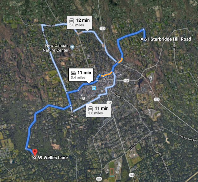 It’s a ten minute drive from 69 Welles Lane New Canaan to 61 Sturbridge Hill Road, New Canaan. I googled directions and JDs rental home is approximately 3.4 miles from the Fore Group, LLC property. They gave a couple of options but Frogmore Road was in two.