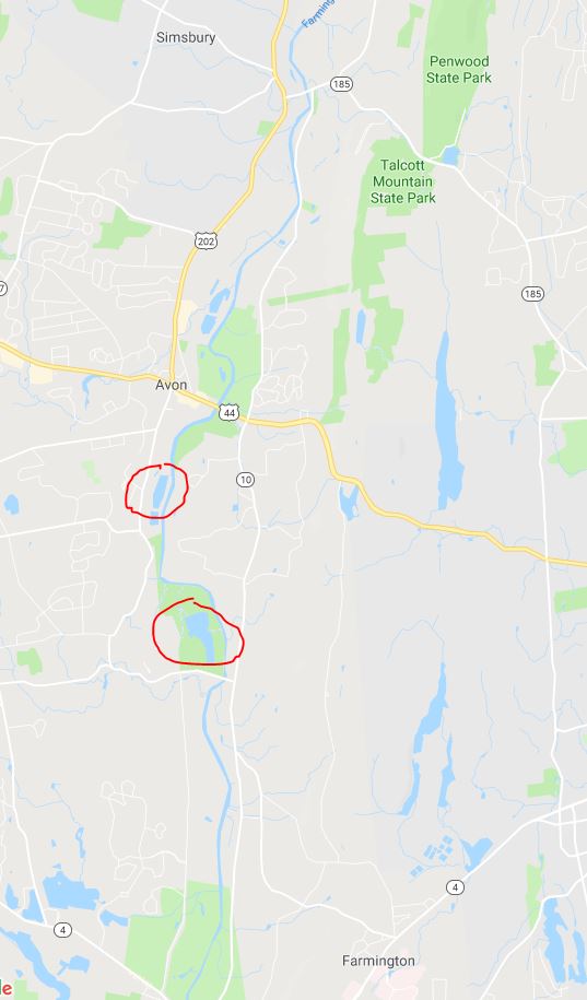 Simsbury (south part about 8-10 minutes from farmington) is the town north of Avon. Farmington is just south of Avon. The water searches have been in Avon (fisher meadow and "the pond")