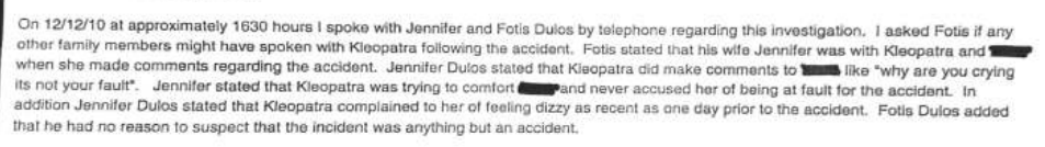 "Fotis stated his wife Jennifer was with Kleopatra..." <- this part is just FD stating that; he may well have had huge reasons to lie. It's said first, as if to make us think JD was there with Kleopatra - but JD doesn't really state that she was - it sounds more like JD's words were repeats of what she heard from the nanny - or, possibly, just from FD saying "this is what the nanny said." (Did JFD speak Greek enough to understand the Grandmother OR nanny?) It's not clear to me/I don't think that FD's mother said the words about "not her fault" directly to JF at all, even if she did understand Greek.