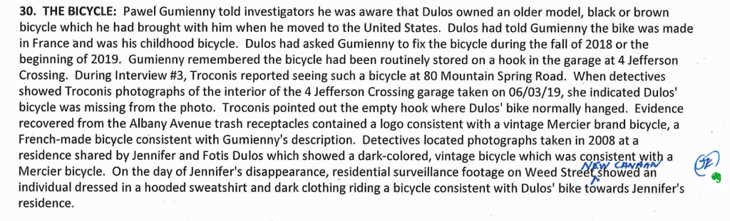 A couple of things stick out in the new arrest warrant for Dulos - the unique bicycle that apparently missing which would explain how he got from Waveny Park to Jennifer's house. There is surveillance showing a man in a hoody not identifiable riding bike on Weed Street on May 24.