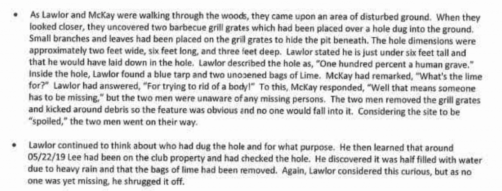 KM's arrest warrant referred to lime in the shallow grave. Now, we are talking about lye? Did I miss something, or are we just considering possibilities?