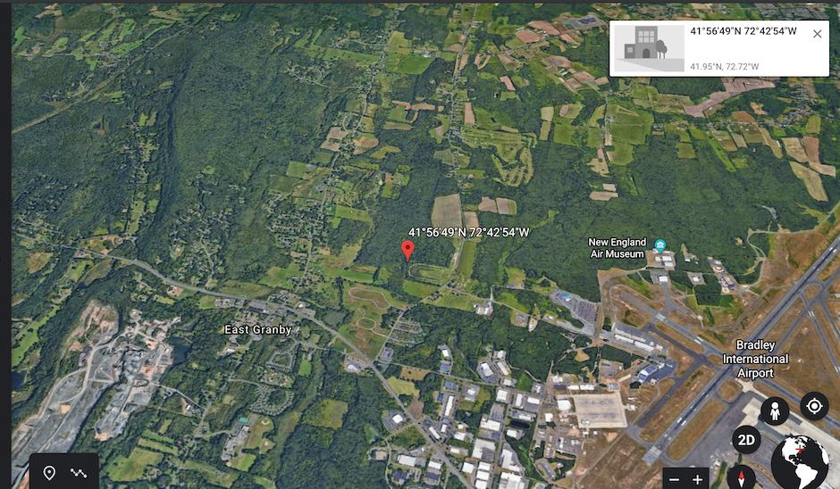 You will see Bradley International Airport, open space, commercial businesses in surrounding area, what looks to be a small lake, reservoir, CT River, some kind of composites yard which might be Tilcon CT which is a large concrete supplier.