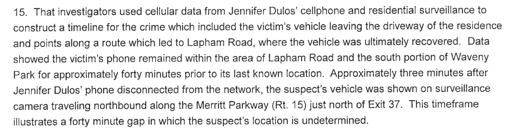 Fd 40 unaccounted for minutes at Lapham in New Canaan with apparently no tire tracks to indicate a second vehicle at that location.