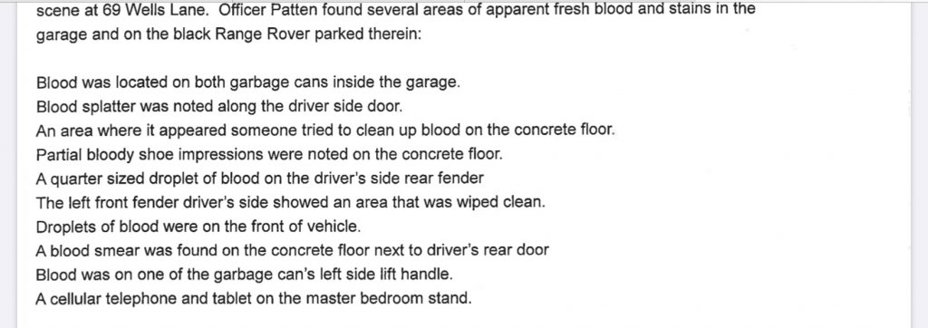 True! However, I don't recall this tidbit in the warrants: "Sources said state police impounded the vehicle from a car dealership that was fixing the accident damage and found a WeatherTech floor liner with blood-like stains on it."