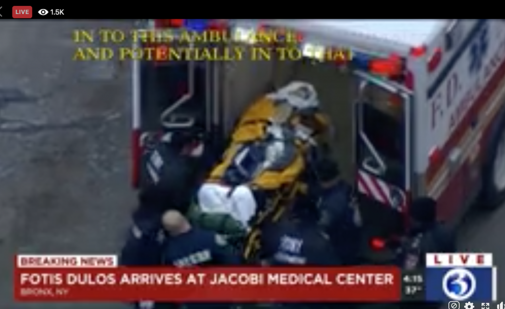 FD put in FDNY Ambulance and taken to Jacobi Hospital 4:14pm EST
