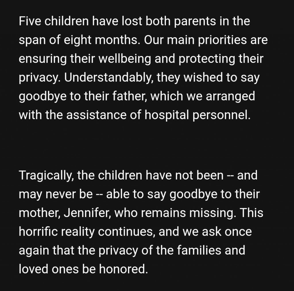 Statement sent to me from Jennifer Farber Dulos family & friends spokesperson Carrie Luft. Confirms kids went to say goodbye to their father at Jacobi. Investigation aside - can you fathom this horrible tragedy?