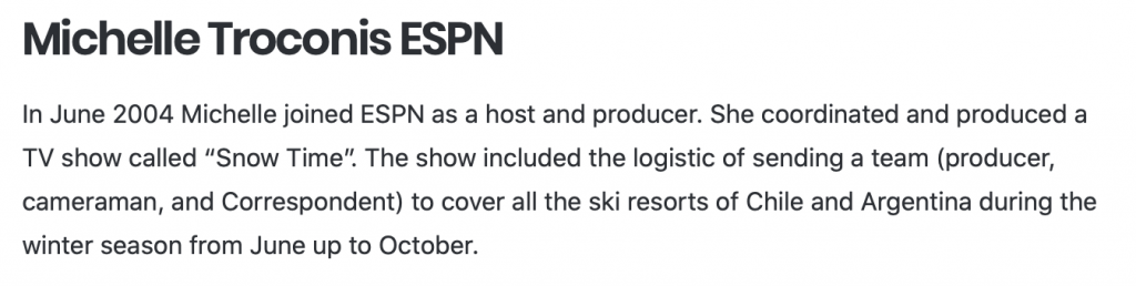I believe MT worked for ESPN Argentina in 2004, as noted in the attached. I doubt she had any reason to be at the ESPN Headquarters in CT. I guess she could look for employment, otherwise I do not see her going to Bristol for ESPN. So, I do not see ESPN as the reason for any familiarity with the Bristol area.