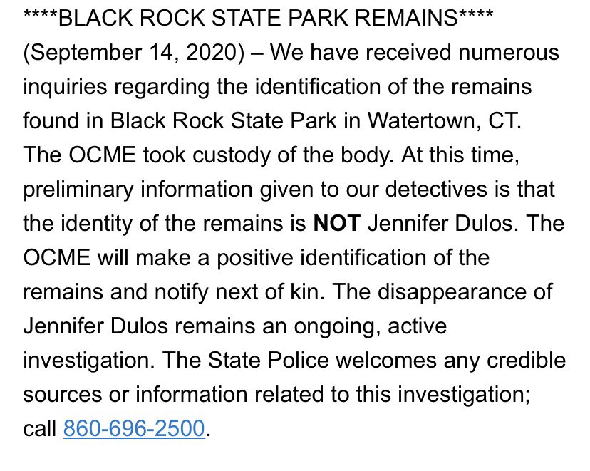 , the female remains found at Black Rock State Park are not connected to the Jennifer Dulos case