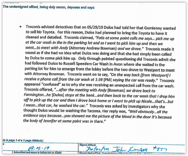 Troconis gasped when detectives pulled out a photo of a bloody pillow found in the trash by a vagrant in Hartford and said it was stained with the blood of Jennifer Dulos. “No, no I don’t know anything about that pillow,” she said.