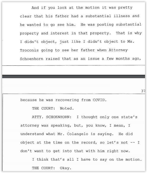AS started with the line, "I thought only one State's attorney was speaking, (insert scowl) but, you know, I mean, I understand what Mr. Colangelo is saying. (rest below)