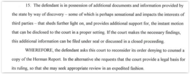 His initial request was presented to the press in a late summer/fall post-hearing press conference. The Troconis ladies and JS were lined up and he says, "We're entitled to see the report. Dr. Herman interviewed my client and she wants to see what he said about her." In court he said he would keep whatever was in the report confidential and then delivers this at the press conference.
