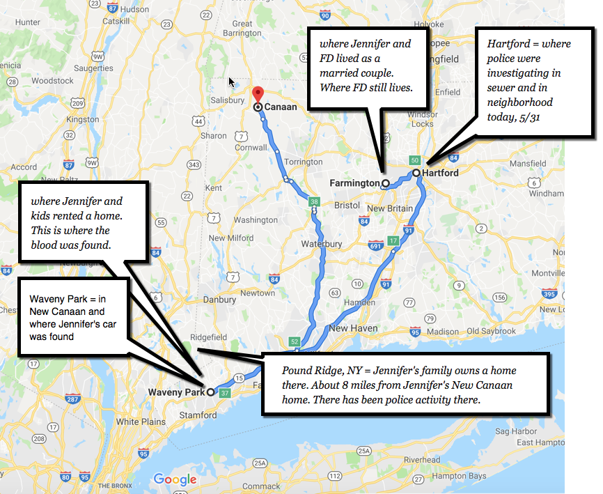 The locations where we have had searches: New Canaan, CT (Dulos rental house, Waveny Park, Irwin Park), Hartford, CT (2 downtown locations today) and Pound Ridge, NY (house of JD mother). Its unclear if Farmington locations (if any) were searched. It was also unclear to me whether STBX and mistress were in the house where they were interviewed by the police or if they were in another location in the area and drove to the house to be interviewed. I'm curious how many properties he has in Farmington and whether the mistress has her own house or lives with him or whether she has family in the area. Lots of unanswered location questions that I hope the press pursue. Also, why was he driving a car with a Maryland plate? We have seen no commentary about any connection to Maryland.