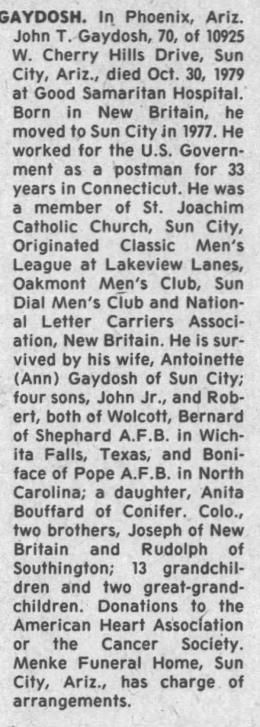 [h=3]Details of Disappearance[/h] Gaydosh was last seen in New Britain, Connecticut sometime in June 1963. He went to work and never returned home, and has never been heard from again. The day after his disappearance, his vehicle was found near a pond. Few details are available in his case.