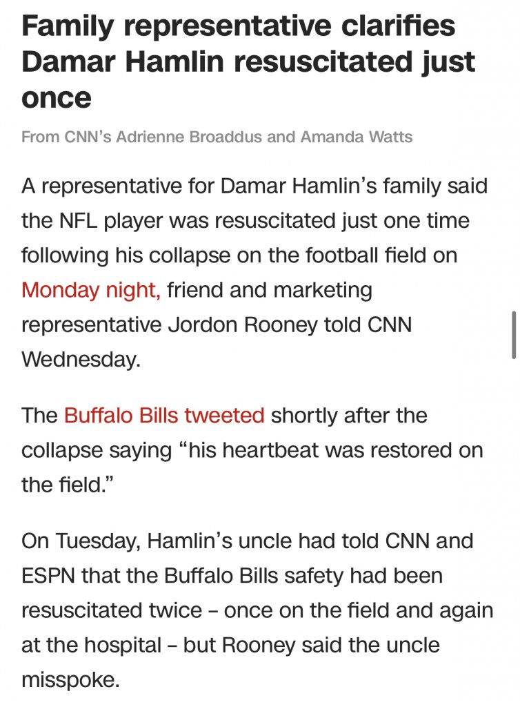 I was just watching the news a while earlier and head his manager being interviewed. He said Damar's uncle was mistaken, he was only resuscitated once. He said all the medical info, etc. is confusing and easy to misunderstand.